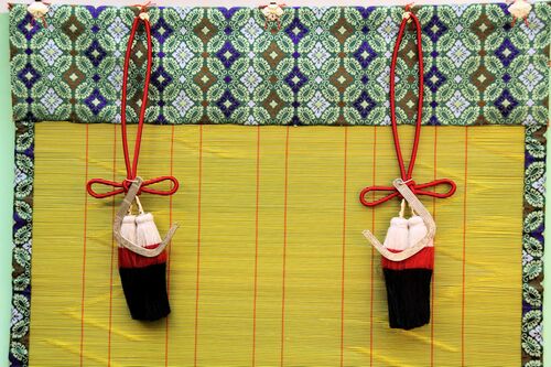 家庭で使うならテトロン縁で十分 あとは竹ひごを染めるか染めないか 家庭の中で神仏を祀る場所は限られているかと思う、その限られた場所の中で凹んだ部分に入れているのであれば、その手前に神前御簾、仏前御簾を掛けておくことがよくある。 床の間でもそう…
